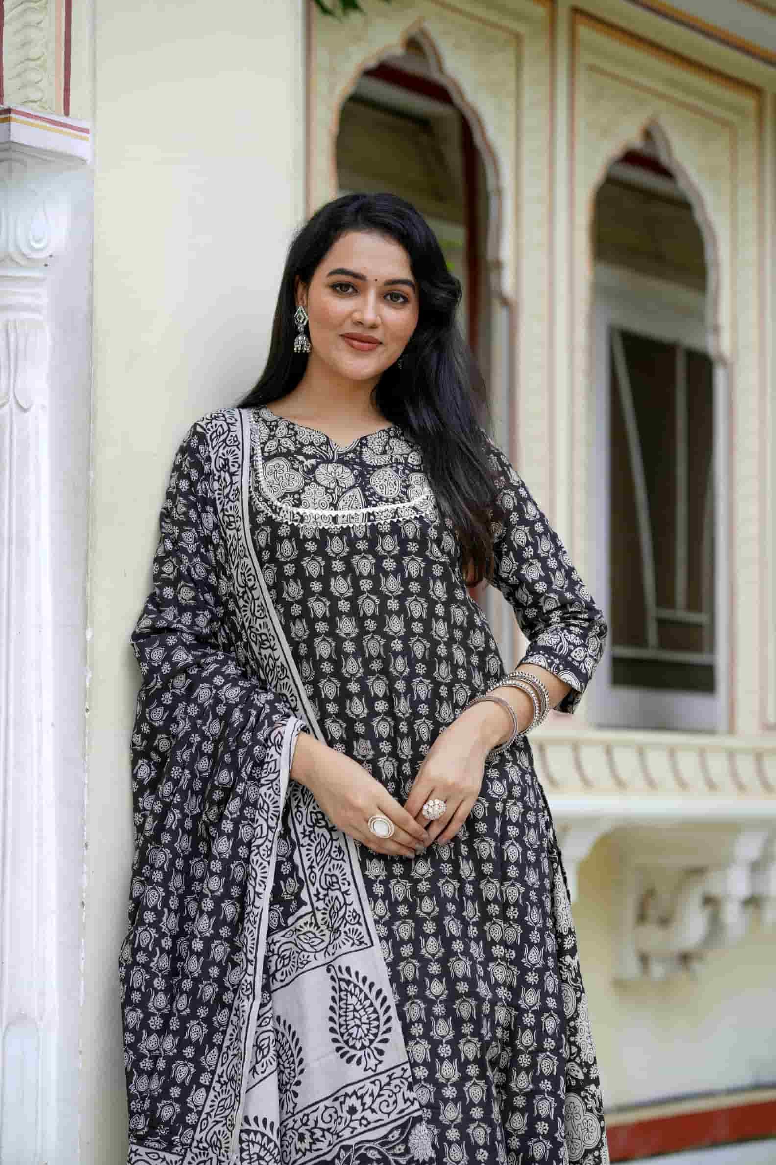 A hand block printed cotton Kurta & Skirt is typically made from lightweight and soft cotton fabric that has been block printed by hand using traditional techniques. The design is created using intricately carved wooden blocks that are dipped in dye and then pressed onto the fabric to create unique patterns and motifs. The result is a beautifully crafted and artistic garment that showcases the skill and craftsmanship of the artisans who create it.