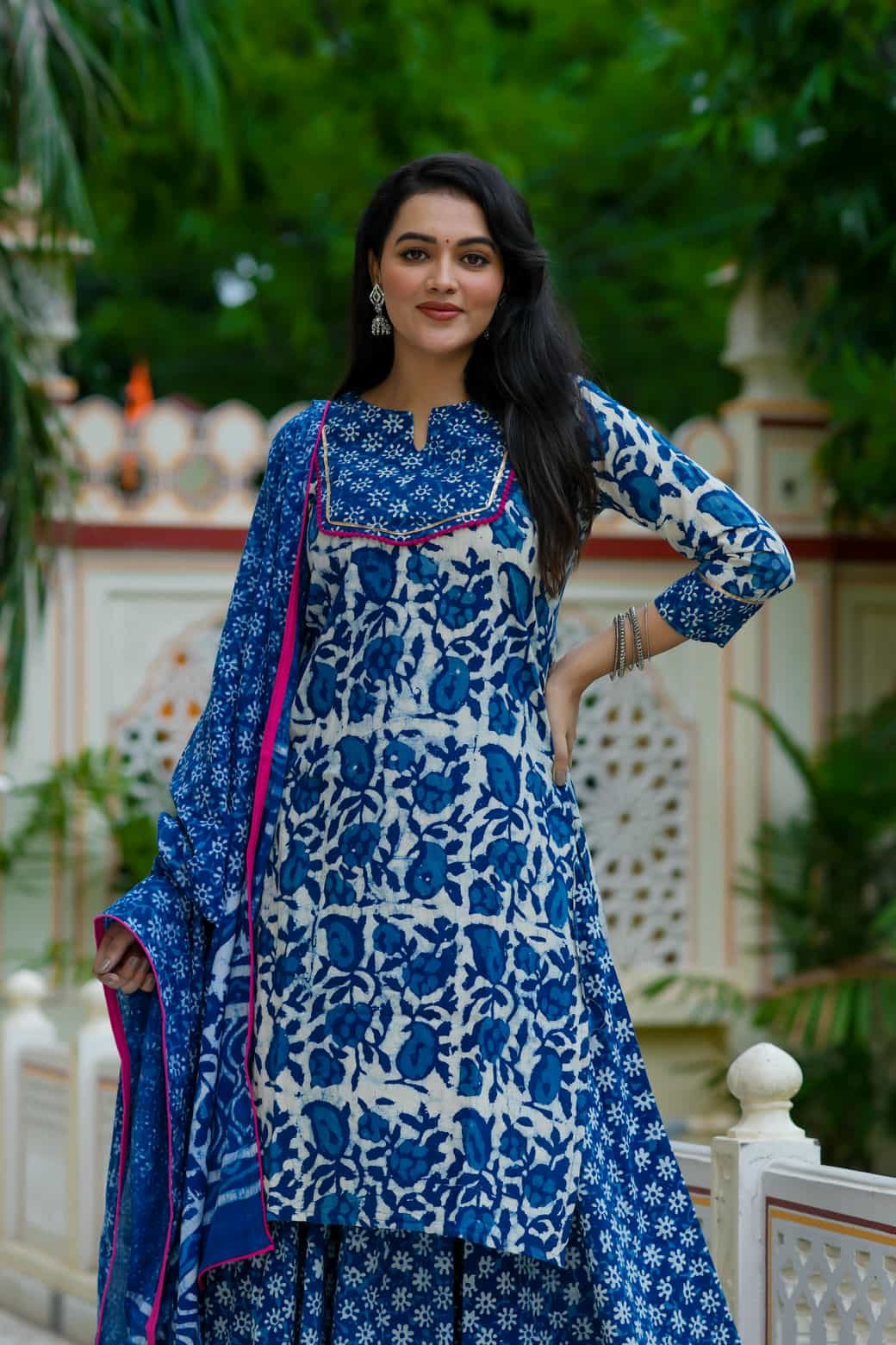 Indigo Daabu Print Cotton Kurti Skirt With Dupatta