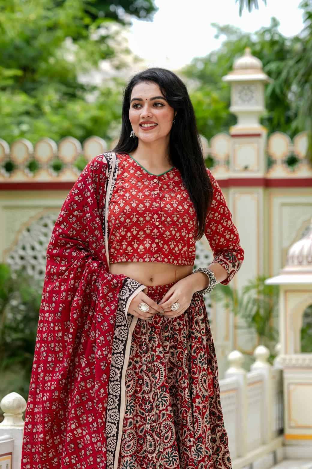 A hand block printed cotton Chaniya [Lehanga] Choli is typically made from lightweight and soft cotton fabric that has been block printed by hand using traditional techniques. The design is created using intricately carved wooden blocks that are dipped in dye and then pressed onto the fabric to create unique patterns and motifs. The result is a beautifully crafted and artistic garment that showcases the skill and craftsmanship of the artisans who create it.