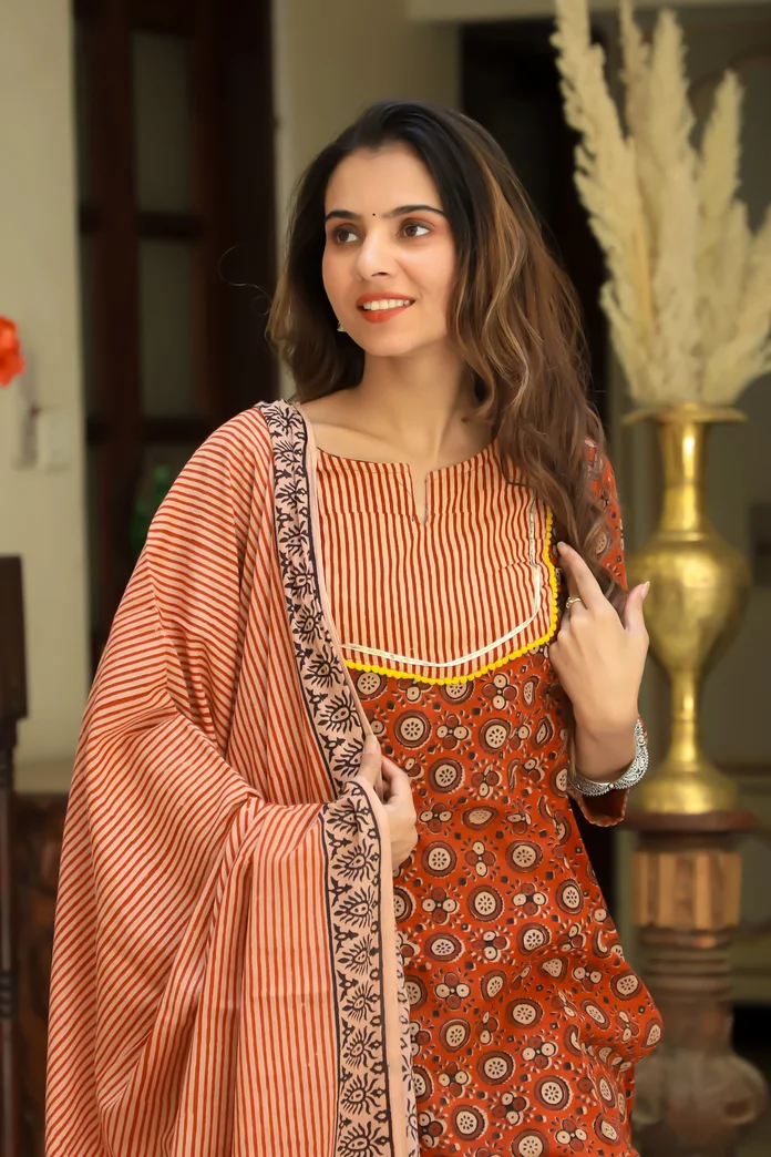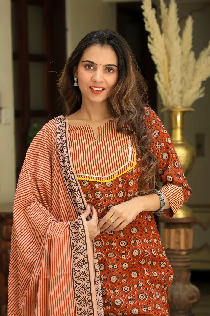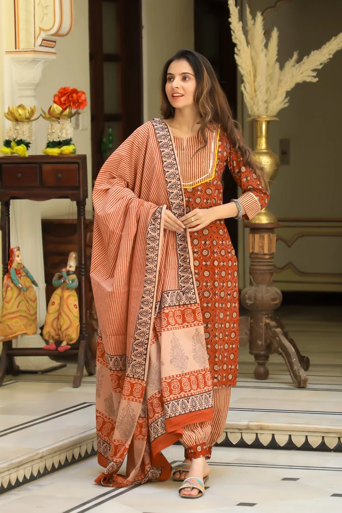 This appealing Afghani Suit for women is a blend of our traditional Rajasthani Hand Block Print designs and modern trends. It comes with Beautiful Yoke Design on the front . Made from 100% pure cotton, this cotton fabric is super-soft to touch and smooth to wear. Pair it up  and go out for a casual look!
